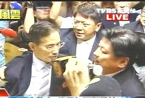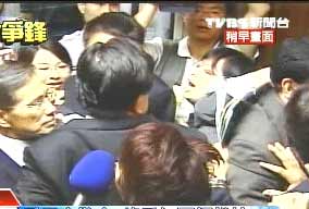 經(jīng)劉盛良幾度宣布休息進(jìn)行協(xié)商,仍無法平息藍(lán)綠“立委”的爭議,此時(shí)趕來的民進(jìn)黨、國民黨“立委”愈來愈多,在國民黨“立委”周守訓(xùn)要求先進(jìn)行會(huì)議詢答、蔣孝嚴(yán)提出散會(huì)動(dòng)議后,雙方?jīng)_突一觸即發(fā)。