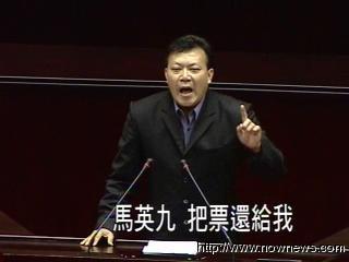 民進(jìn)黨“立委”蘇震清嗆聲說(shuō),“馬英九把票還給我!”不過(guò)國(guó)民黨“立委”徐少萍馬上反擊:“我不知道蘇委員你是不是把票投給馬英九,不然你不能代表所有的臺(tái)灣同胞!