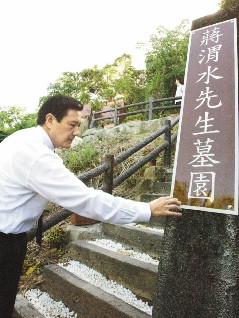 但因墓前傾頹敗破,磚石廢物垃圾雜亂堆置,要前往追思無路可循,因此蔣渭水之孫蔣朝根今年四月向馬英九反映,馬英九再轉(zhuǎn)告知臺(tái)北市府,重新規(guī)劃新步道。因此馬英九今天是修葺完成后特別前往追念,這也是臺(tái)灣地區(qū)領(lǐng)導(dǎo)人第一次到蔣的墓前瞻仰致敬。