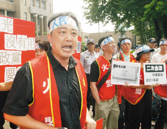 “人民火大聯(lián)盟”昨天到民進(jìn)黨中央抗議,活躍于社運(yùn)界、同時(shí)也是民進(jìn)黨秘書長(zhǎng)王拓兒子的王醒之(左二)帶頭喊口號(hào)