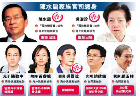 陳由豪對(duì)陳水扁“黑金疑云”開出關(guān)鍵第一槍之后,引發(fā)多米諾骨牌效應(yīng),接下來的四年,每次陳家曝光新的貪腐丑聞,臺(tái)灣老百姓都被嚇得目瞪口呆。陳水扁2004年連任后實(shí)行財(cái)產(chǎn)信托,申報(bào)財(cái)產(chǎn)從1994年任臺(tái)北市長前的1000萬元,飆漲到2003年底的7000萬元,股票市值從最初的55萬增至3億多元;2004年,媒體爆出吳淑珍收受SOGO百貨總值880萬元購物禮券,介入SOGO經(jīng)營權(quán)爭奪戰(zhàn);2006年5月,陳水扁的女婿趙建銘被指控涉嫌臺(tái)開股票內(nèi)線交易;2006年6月,吳淑珍卷入“國務(wù)機(jī)要費(fèi)案”。