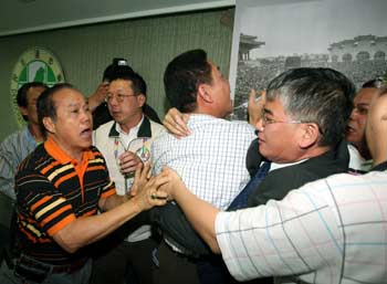 中新網(wǎng)10月13日電 民進(jìn)黨秘書長(zhǎng)王拓日前批評(píng)黨內(nèi)流行情義相挺的談話引發(fā)部分黨內(nèi)人士不滿。臺(tái)北市黨部主委黃慶林今天率眾到民進(jìn)黨中央抗議并要求王拓下臺(tái),中央黨部副秘書長(zhǎng)洪耀福接見時(shí)提及,“當(dāng)初第一個(gè)主張開除陳水扁的就是黃慶林”,此言立即引發(fā)沖突,黃慶林要求洪耀福道歉,但洪耀福拒絕。