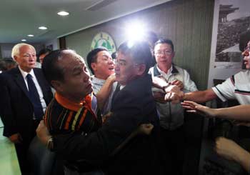 洪耀福代表接見時(shí)表示,用人是黨主席的權(quán)利,陳水扁海外匯款案發(fā)生至今,黨中央沒有說過一句重話,黃慶林是第一個(gè)主張開除陳水扁,此語一出引發(fā)黃慶林不滿,場(chǎng)面混亂,黃慶林帶來的支持者與黨部人員發(fā)生扭打,最后洪耀福在黨工的保護(hù)下先行離開。