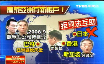 據(jù)臺灣TVBS報道,或許該這么形容,扁家的國際觀、在資金處理上顯露無遺。因為除了已曝光的5間紙上公司,9月初艾格蒙聯(lián)盟又查出,扁家在亞洲有一個未曝光的賬戶,而且不是在新加坡,也排除了不肯提供司法互助數(shù)據(jù)的日本,除了香港,另一個可能就是亞洲知名的避稅天堂巴林。