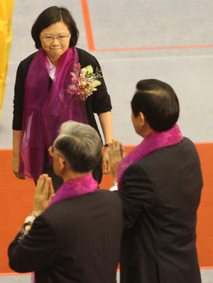 記者:“剛在后臺有機會和馬英九有互動嗎?”民進黨主席蔡英文:“好像有握手耶。”記者:“有講話嗎?”蔡英文:“不記得了,好像有握手!