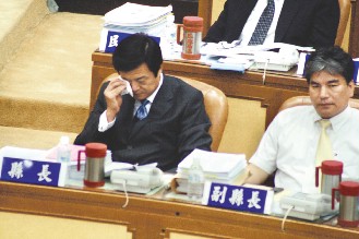臺北縣長周錫瑋(左)30日談及臺中縣市合并“升格”案時落淚表示,該案進度如果超前臺北縣“升格”案,將辭去縣長職務(wù)。(圖片來源:臺灣《聯(lián)合報》)