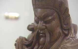 在8月初記者會(huì)曝光的關(guān)公神像,一走入陳水扁卸任后的辦公室,柜臺(tái)顯得空蕩蕩,沒有什么擺設(shè),往內(nèi)一走在廊道的正中間,馬上映入眼簾的就是長長的三個(gè)擺飾柜,一共有六樣紀(jì)念品,但最受矚目的是一尊木雕的關(guān)公像,長長的胡子略帶笑容,一派自在的關(guān)公悠閑的坐在椅子上,既沒有拿刀也沒有看書,反倒像是笑看世間事,左下側(cè)也有一尊玉雕的關(guān)公頭像,也就是半身關(guān)公。
