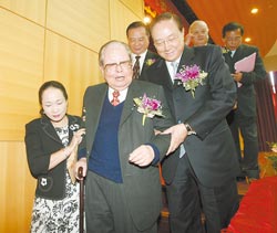 關中1日就任臺當局“考試院長”一職,完成印信交接后,關中(前右)扶前任“院長”邱創(chuàng)煥(左二)下樓梯,頗有接棒的意涵。(來源:臺灣《中國時報》)