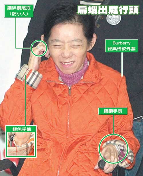 吳淑珍上次出庭時(shí)穿著七萬(wàn)多元的Dior雪衣,配戴大顆翡翠尾戒,且面對(duì)鏡頭時(shí)態(tài)度相當(dāng)不悅,不時(shí)露出不耐煩的表情。昨天出庭時(shí),吳淑珍改穿Burberry價(jià)格約三萬(wàn)元鋪棉外套,改戴另一只鑲碎鉆尾戒,鉆石較小、較為秀氣,吳淑珍的態(tài)度也變得和善許多。