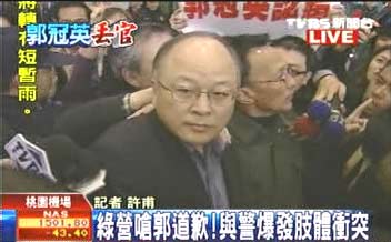 當(dāng)郭冠英搭上座車離開時,抗議人士還追打座車,黑衣男子則揮拳毆打抗議人士,雙方人馬在機(jī)場外持續(xù)叫囂。