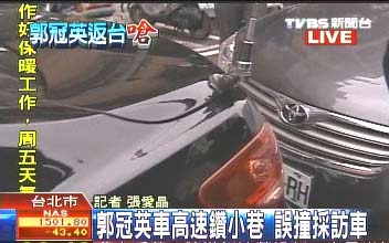 之后,郭冠英座車抵達(dá)臺北市區(qū),在媒體車輛的跟拍下,發(fā)現(xiàn)郭冠英的座車在臺北市大小街頭繞來繞去,并未前往“新聞局”也未返家,似乎想要把記者跟車甩掉。郭冠英座車甚至一度和緊跟的媒體采訪車在臺北醫(yī)學(xué)院附近發(fā)生輕微擦撞,由于人車并無大礙,郭冠英車輛隨即再度駛離,并繼續(xù)在臺北街頭亂逛。