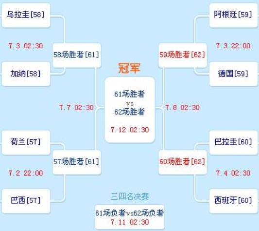 中新網(wǎng)6月30日電 北京時(shí)間30日凌晨,南非世界杯1/8決賽全部結(jié)束,西班牙隊(duì)和巴拉圭隊(duì)在最后一個(gè)比賽日的爭(zhēng)奪中踏上了八強(qiáng)的末班車。至此,世界杯八強(qiáng)全部產(chǎn)生,八強(qiáng)賽的對(duì)陣形勢(shì)是:荷蘭VS巴西,烏拉圭VS加納,德國(guó)VS阿根廷,巴拉圭VS西班牙。