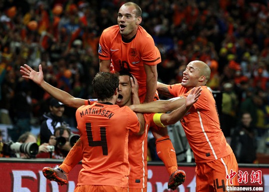 中新社北京7月7日電 在今天凌晨進(jìn)行的一場(chǎng)南非世界杯半決賽中,荷蘭隊(duì)3比2險(xiǎn)勝烏拉圭,率先晉級(jí)決賽。荷蘭球員斯內(nèi)德攻入一球,幫助自己的球隊(duì)再度領(lǐng)先,他被評(píng)為本屆比賽的最佳球員。其在本屆世界杯上的進(jìn)球數(shù)已增至5個(gè),與西班牙球員比利亞并列領(lǐng)先射手榜。