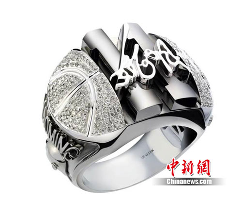 這枚戴夢得“至尊鉆戒”鑲嵌有248顆鉆石,表面是籃球紋樣點綴晶瑩的鉆石,中部用黑金凸起的色塊寫就姚明在休斯頓火箭隊的隊服號碼,其上再鐫刻姚敏名字的手寫體,戒指側面還有姚明的頭像和英文“YaoMing”的字樣。