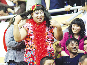 昨天的南京奧體看臺上,還來了一位貌似乳神的人,這究竟是什么回事呢?昨天比賽還沒開始,奧體中心體育場的50區(qū)看臺就熱鬧無比。很多球迷紛紛圍到一名打扮性感的人邊上,爭相與“她”合影。而本報記者也從內(nèi)場走到看臺附近一探究竟。原來,這是一位老舜天球迷,聞之巴拉圭正版乳神因故未能前來南京,為了彌補大家的遺憾,也是順便活躍一下現(xiàn)場氣氛,照著巴拉圭乳神里克爾梅的外形好好地裝扮了一下自己。由于這位男球迷是反串表演,所以他還特意用材料加以修飾,讓自己胸部的豐滿程度更加接近于乳神。于是,他便成為了昨天現(xiàn)場最為“耀眼”的明星,受歡迎程度甚至超過了巴拉圭球星圣克魯斯。除了這位比較搞怪的球迷,昨天來自全國各地的著名球迷也聚集奧體中心,“羅西”、“胖哥”等等耳熟能詳?shù)拿譃槟暇⿰W體中心的這場中巴之戰(zhàn)增色不少。