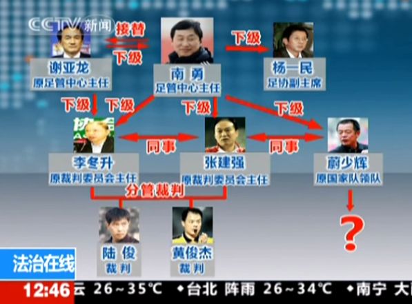 中新網9月13日電 自上周末公安部證實前謝亞龍、李冬升和蔚少輝已被立案偵查之后,中國足協(xié)已有多人被抓。中央電視臺在今天的新聞節(jié)目中,解析了“足協(xié)高官涉案”的“關系網”。