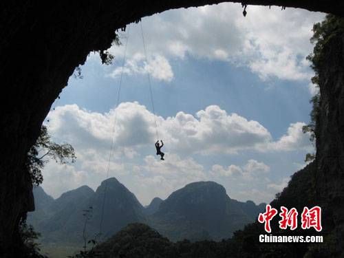 中新網(wǎng)河池9月18日電(陸旺)9月18日,廣西羅城國際攀巖賽在中國唯一的仫佬自治縣——廣西河池市羅城仫佬族自治縣的月亮山開賽。被視為2010羅城攀巖旅游節(jié)的重頭戲,中外80名攀巖愛好者以及部分觀眾上午8點(diǎn)鐘便聚集在形狀宛若一輪明月的月亮山下,相互“攀比”、切磋攀巖技術(shù)。