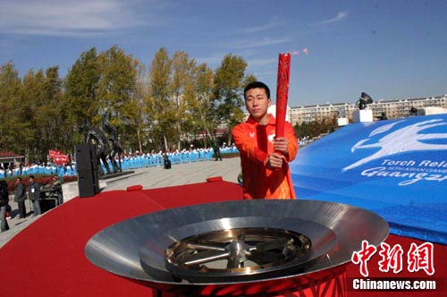 火炬最后傳到長春市公安消防支隊凈月大隊消防員孟繁金手中,由他在長春雕塑公園主雕塑前點燃圣火盆;鹁?zhèn)鬟f現(xiàn)場還舉行了一系列群眾性全民健身展示活動,來為廣州亞運會加油助威。