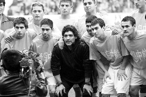 按照此次溫暖中國行的計(jì)劃,馬拉多納帶領(lǐng)的阿根廷隊(duì)將與李明領(lǐng)銜的山東國腳進(jìn)行一場義賽,所得款項(xiàng)捐獻(xiàn)給中國紅十字基金會,屆時老馬將會親自登場比賽。下午14時30分左右,奧體中心體育場已經(jīng)坐了一大半球迷,有人穿著阿根廷國家隊(duì)的藍(lán)白球衣,有人舉著紀(jì)念圍巾。球場上兩支隊(duì)伍在熱身,并不見主角馬拉多納的影子,工作人員稱他還在飛機(jī)上。