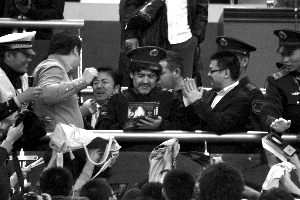 簽名、繞場一周、顛球、演講……馬拉多納用盡了招數(shù)也沒能取悅昨日來濟(jì)南奧體中心觀看比賽的球迷,因?yàn)樗麄兌际菦_著“老馬保證登場不少于20分鐘”這個噱頭而來,但是球王并未如約展示球技。