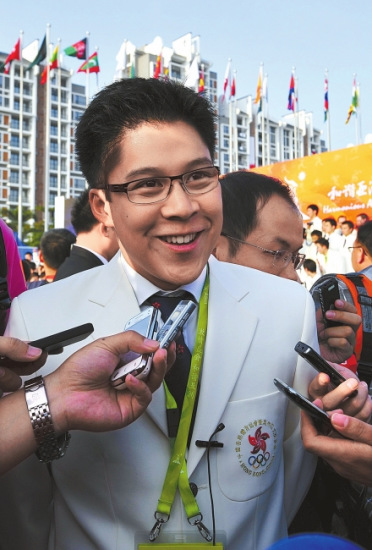 升旗儀式結(jié)束后,霍啟剛便和香港代表團(tuán)的運(yùn)動(dòng)員們簇?fù)碓谝黄鸷嫌傲裟,作為代表團(tuán)副團(tuán)長的他,自然沒有忘記自己的身份!斑@一次你會(huì)去看跳水嗎?”當(dāng)華西都市報(bào)記者將這個(gè)問題拋給霍啟剛時(shí),他笑了一笑:“我就知道你要問我這個(gè)問題,在香港我就一直被問這個(gè)問題,到這里來還是被問這個(gè)問題,哈哈!被魡偟钠胀ㄔ挿浅(biāo)準(zhǔn),周圍的香港媒體聽到了霍啟剛這樣回答,也都笑了起來。