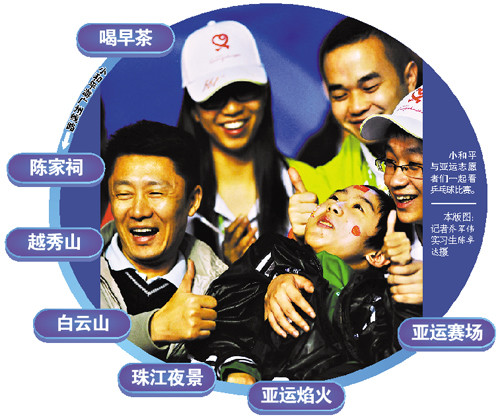 他叫徐和平,是一位受廣州企業(yè)家資助從四川地震災區(qū)來穗治病的少年(見本報11月10日A21版和11日A19版相關。十多天前,得知他治愈無望,志愿者通過本報呼吁:在小和平返鄉(xiāng)前,請熱心廣州人當導游,領著他逛逛花城、感受亞運氣息。這一刻,在廣州亞運會的賽場上,小和平的夢想都實現(xiàn)了。