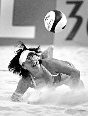 亞運(yùn)會(huì)沙排半決賽,中國選手張希飛身救球,她和搭檔薛晨晉級(jí)決賽。新華社發(fā)