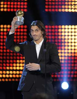 12日晚,效力于意甲國(guó)際米蘭隊(duì)的瑞典國(guó)腳伊布拉希莫維奇在斯德哥爾摩榮獲2007年瑞典最佳男足運(yùn)動(dòng)員稱號(hào)。
