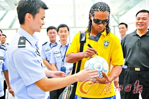 羅納爾迪尼奧在白云機場為工作人員簽名。