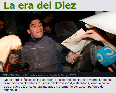 《奧萊報》以“10號的時代”為標題,第一時間發(fā)表了這條消息。阿根廷時間10月28日下午,馬拉多納在和格隆多納面談后確定了自己將成為新的國家隊主教練。他說:“我將自己組建球隊!蓖瑫r他還表示,教練組將以他86年世界杯奪冠時的球隊成員為主,甚至當(dāng)時的冠軍主帥比拉爾多也有可能再度出山,輔佐愛徒。