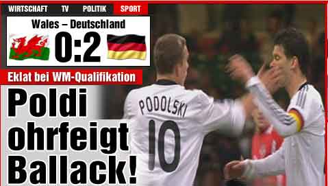 中新網(wǎng)4月2日電 在今天凌晨進行的一場世界杯歐洲區(qū)預(yù)選賽中,德國隊客場2-0輕取威爾士。不過在比賽中,隊長巴拉克和前鋒波多爾斯基發(fā)生沖突,被隊友在體育場眾目睽睽之下扇了一記耳光。