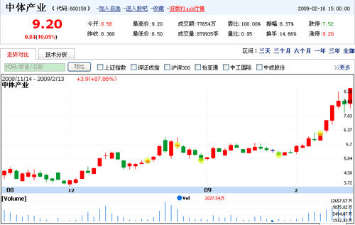 又漲停了!昨天(2月16日)下午,中體產(chǎn)業(yè)(600158)以9.20元漲停收盤(pán),這已經(jīng)是該股近6各交易日以來(lái)第5次漲停,不少被套牢的股民終于解套,并稱(chēng)是謝亞龍解放了他們。由于前中國(guó)足協(xié)專(zhuān)職副主席謝亞龍將于2月26日入主中體產(chǎn)業(yè)董事會(huì),因此筆者在中體產(chǎn)業(yè)股吧注意到,不少股民從一開(kāi)始臭罵和惡搞謝亞龍,轉(zhuǎn)變成了感謝。