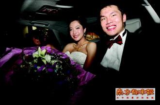 朱芳雨和新娘在婚車上