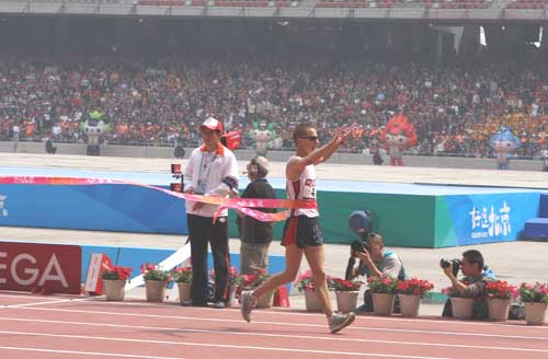 澳大利亞選手扎里德-塔蘭(Jared Tallent)沖過終點(diǎn)線瞬間。(圖片來源于北京奧運(yùn)官網(wǎng))