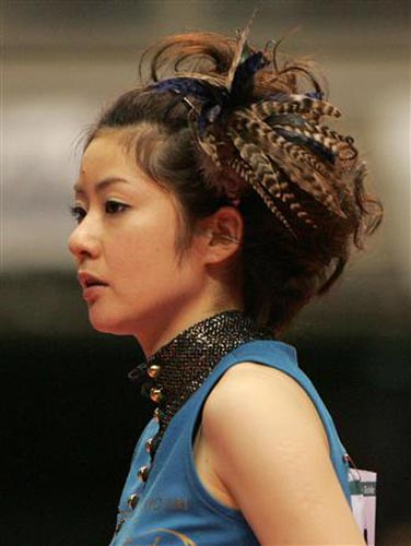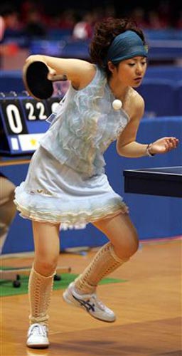 在日本乒壇,福原愛名聲最大,其次就是有著漂亮臉蛋、性感身材的四元奈生美了。今年30歲的四元在日本的影響并不比福原愛低多少。從2007年的全日本乒乓球錦標(biāo)賽至今,這位美女球員每次比賽都會換上不同的時尚超短裙,或是露出香肩的吊帶衫參賽。而且,她的頭飾也都是經(jīng)過發(fā)型師精心設(shè)計的,爆炸式、淑女式……總之,五顏六色的服裝+各類怪異的發(fā)型+比賽場上揮拍動作都是那么的迷人,相比于其他運動員的一臉嚴肅,四元奈生美在賽場上刮起的時尚之風(fēng)迷倒了很多日本男球迷。