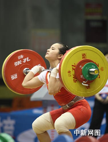 中新網(wǎng)重慶4月24日 (孟幻 李楊陽)第十一屆全國運(yùn)動會女子舉重預(yù)賽暨全國女子舉重錦標(biāo)賽24日在重慶揭幕。在當(dāng)天比賽中,各隊(duì)運(yùn)動員隱藏實(shí)力,只求擦邊挺進(jìn)全運(yùn)會。北京奧運(yùn)冠軍陳燮霞無緣錦標(biāo)賽獎(jiǎng)牌,但她誓言奪取全運(yùn)會金牌。