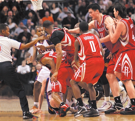 在第三節(jié)將結(jié)束時,火箭大比分領先太陽,但就在此時太陽隊后衛(wèi)巴恩斯一次惡意肘擊,激怒了阿爾斯通,兩人隨即從口角變?yōu)殡p拳相向。眼見戰(zhàn)火燃起,雙方球員都不想讓自家兄弟吃虧,因而即刻加入到了“戰(zhàn)斗”之中,有像姚明一樣勸架的,也有像麥迪一樣上前幫忙的,一時間場面之混亂連解說員都手足無措,一個勁兒驚恐道——“oh,god!”