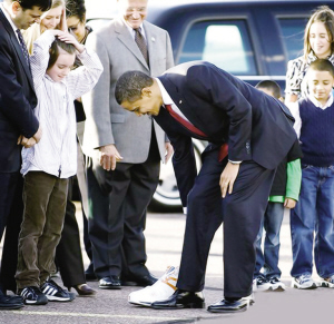 眼見奧巴馬下了飛機后,看到地上這只球鞋,還特別彎下腰,笑著拿自己皮鞋與奧胖這只大鞋比試一下,果然奧巴馬尺寸“小巫見大巫”,全場接機人員都笑成一團。據(jù)悉,這只球鞋為橘色與白色相間,上面有著奧尼爾個人簽名。 ○張喆