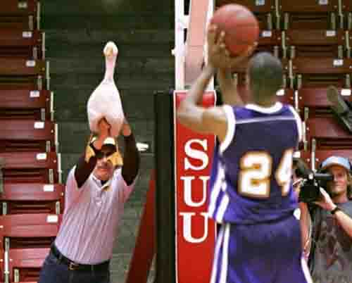 科比站上罰球線,眼睛拼盡全力盯著什么,卻久久不能投出這關(guān)鍵一球,他的心臟足以承受投籃不進(jìn)帶來(lái)的后果,那么,到底發(fā)生了什么?當(dāng)一名如此優(yōu)秀的籃球巨星站到罰球線而遲遲不能出手投籃結(jié)束比賽,肯定有他的原因,答案找到了:在科比走上罰球線的剎那間,他看到了來(lái)自觀眾席客隊(duì)球迷們?yōu)樗麥?zhǔn)備的饕餮大餐——罰球防火墻,一時(shí)間,美女照片、狂舞的塑膠棒、極具創(chuàng)意的搞笑漫畫,甚至可愛的鴨子都成了搞怪的最好道具。