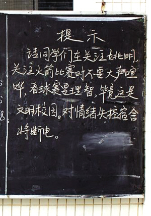在廣州某大學(xué),為限制學(xué)生狂熱的心情,宿管處黑板上出現(xiàn)了一個(gè)奇怪的布告:請(qǐng)同學(xué)們?cè)陉P(guān)注姚明、關(guān)注火箭比賽時(shí)不要大聲喧嘩,看球賽要理智,畢竟這是文明校園。對(duì)情緒失控的宿舍將斷電。