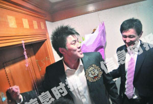 昨天搶新娘的“吉時”定在了凌晨12:15,不過晚上11點左右杜鋒和家人已經(jīng)整裝待發(fā),可他卻表示自己并不緊張,“很平靜,”杜鋒表示對搶新娘這事一點都不擔(dān)心,“該強攻的就強攻,該智取的就智取!碑敱粏柤笆菗屝履镫y還是奪CBA總冠軍難時,杜鋒得意地笑了:“我不搶,她也得跟我走!