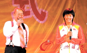 何賽飛的話顯然啟發(fā)了楊秀麗,在記者的“慫恿”下,她向協(xié)辦此次畫展的中體明星隊領(lǐng)隊王奇說了自己的想法。王奇立即將楊秀麗送上了臺并和主持活動的崔永元偷偷交代!岸祭蠋煟埩舨!贝抻涝獙l(fā)言完畢的都本基留在臺上,“奧運冠軍楊秀麗希望能拜您為師學習書法!边@是個意外安排,都本基大師顯得非常激動!斑@個徒弟我收下了!”老人的干脆讓楊秀麗有些驚訝,她深深地向老師鞠了一躬,頭上的汗水晶瑩可見!拔业膵屟,緊張死了,從沒這么緊張過!苯K于如愿的楊秀麗抹了一把汗說,“這下我回去更要好好練字了!