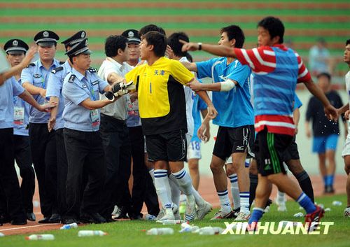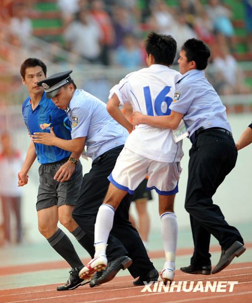 14號劉青在休息室門口看到此景,試圖掙脫警察的阻擋沖上前去。就在天津隊員追打裁判時,一名球員將裁判的電子記錄牌扔在地上狂踩。這時,警察趕到將天津隊員強行分離,并送至球場內(nèi)?磁_上的山東觀眾發(fā)出噓聲,并將水瓶扔向天津隊員。一名天津隊員向看臺伸出了中指,已坐在球場中間的李根聽到球迷的罵聲后再次沖出人群試圖爬上看臺,被警察制止。