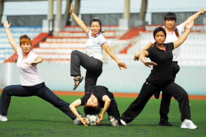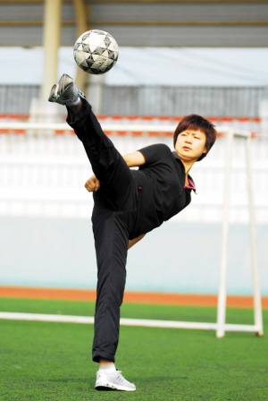 董靜拿了個足球在場上顛,基本上只能顛三四個。立在體育館門前的武術(shù)班教練簡介上寫著,董靜曾獲得過河北散打錦標(biāo)賽65公斤級冠軍,但讓她參加散打比賽行,讓她控制好這個小小的皮球,卻不容易。美女功夫足球隊(duì)名聲在外,真要踢起比賽來,不堪一擊。她們和當(dāng)?shù)貓F(tuán)委及一家外企的男隊(duì)進(jìn)行過兩場較量,結(jié)果慘不忍睹。