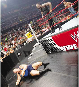 兩個(gè)大個(gè)子在場(chǎng)上僵持,這時(shí)臺(tái)下的克萊姆·泰姆沖了過來,一腳踹中“表演者”,把兩人分開。奧尼爾突然襲擊,沒有利用繩圈的反彈,直接沉肩把體重超過220公斤的“表演者”撞倒在臺(tái)上。一擊得手后的奧尼爾非常得意,高舉雙手,向場(chǎng)下的球迷歡呼。