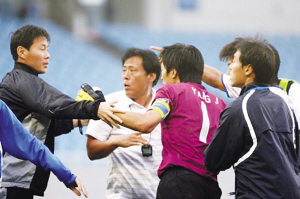 然而與舜天輸球相比,昨天比賽最大的看點(diǎn)就是被稱為“桑拿裁判”的陶然成在比賽中遭到天津隊(duì)圍攻的事情,由于對(duì)點(diǎn)球判罰的不滿,天津隊(duì)群情憤怒,如果不是南京公安的阻攔,差點(diǎn)就重演了天津全運(yùn)隊(duì)爆追何志彪并一腳將其推倒的好戲。