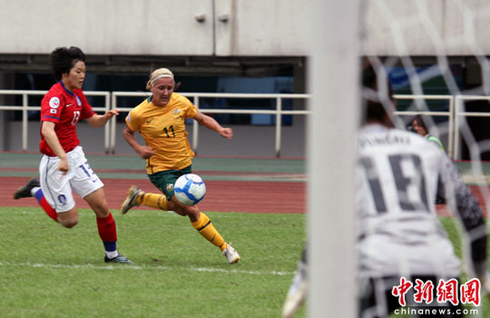 中新網(wǎng)成都5月21日電(記者劉賢 劉忠俊)2010年女足亞洲杯第二輪小組賽21日下午在成都舉行。繼首場(chǎng)2比0勝越南后,澳大利亞今日再以3比1勝韓國(guó),確保小組出線。