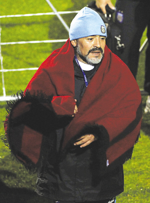 當(dāng)阿根廷隊(duì)剛剛結(jié)束訓(xùn)練,馬拉多納一行正要返回更衣室,這時(shí)兩個(gè)來自薩爾塔市(布宜諾斯艾利斯以北的小城)的阿根廷記者走了過來向老馬講述了他們長途跋涉帶來禮物和祝福的故事,馬拉多納本來是快步走向更衣室的,聽到記者的故事立刻停了下來!斑@是來自San Antonio de Los Cobres,一個(gè)海拔4000米小城孩子們的禮物,他們托我們?yōu)槟銕砹颂鹤!甭牭竭@里馬拉多納的真性情顯露無遺,接過毯子立刻披在了身上。這個(gè)被提到的小城叫做 San Antonio de los Cobres,距薩爾塔市約180公里,距布宜諾斯艾利斯約1750公里,海拔高達(dá)4000米,那里的球迷無法通過電視來觀看世界杯的比賽,但是他們一樣喜歡馬拉多納,關(guān)注阿根廷隊(duì)。許凱 黃啟元 本報(bào)南非專電