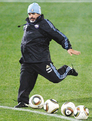 300名記者,上百支“長槍短炮”,密密麻麻擠滿了訓(xùn)練球場的看臺。沒有梅西、伊瓜因,阿根廷人的訓(xùn)練并不寂寞。只因?yàn)橐粋(gè)人的存在,馬拉多納。沒有任何懸念,所有的風(fēng)頭,都被老馬一人搶光。