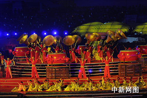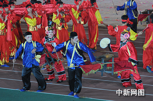 在運(yùn)動(dòng)員入場(chǎng)式后,以“歡樂農(nóng)運(yùn)•親情海峽•和諧中華”為主題的大型文體表演《大地情飛揚(yáng)》正式開始。整臺(tái)節(jié)目具有濃郁的閩南地域文化特色,為觀眾獻(xiàn)上了一道氣勢(shì)磅礴的視覺大餐。